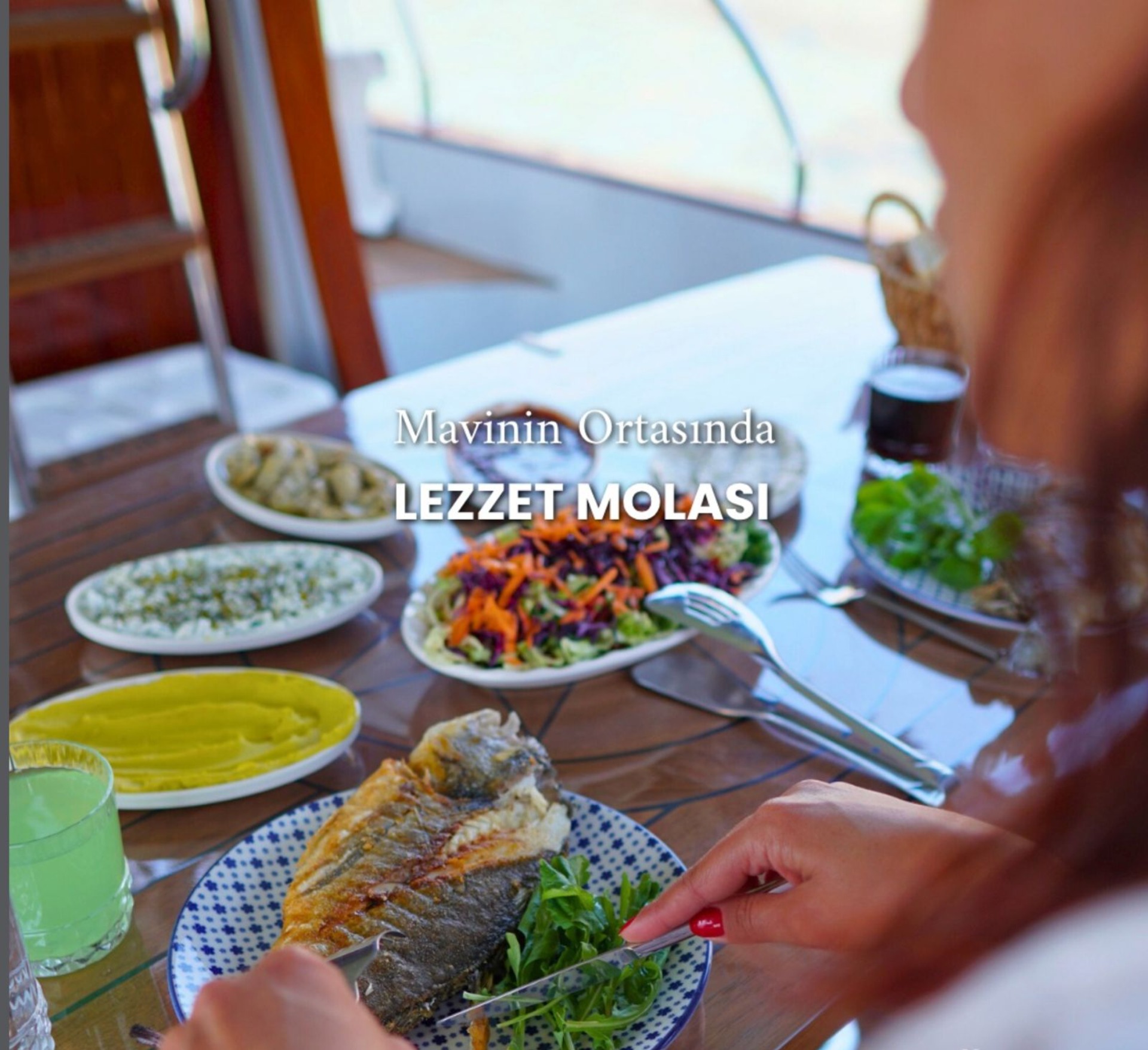 Tur boyunca turkuaz sularda yüzme molaları 🏊‍♂️ vererek serinliyor, güneşlenerek dinleniyorsunuz. Öğle saatlerinde 🍽️ yemeğinizi dilediğiniz şekilde hazırlayabiliyor ya da yanınızda getirdiğiniz kumanyayı mürettebatımızın pişirip servis etmesini isteyebiliyorsunuz. Gün içinde dilediğiniz zaman yüzebilir, güneşlenebilir ya da koyların sakin atmosferinde keyif yapabilirsiniz.