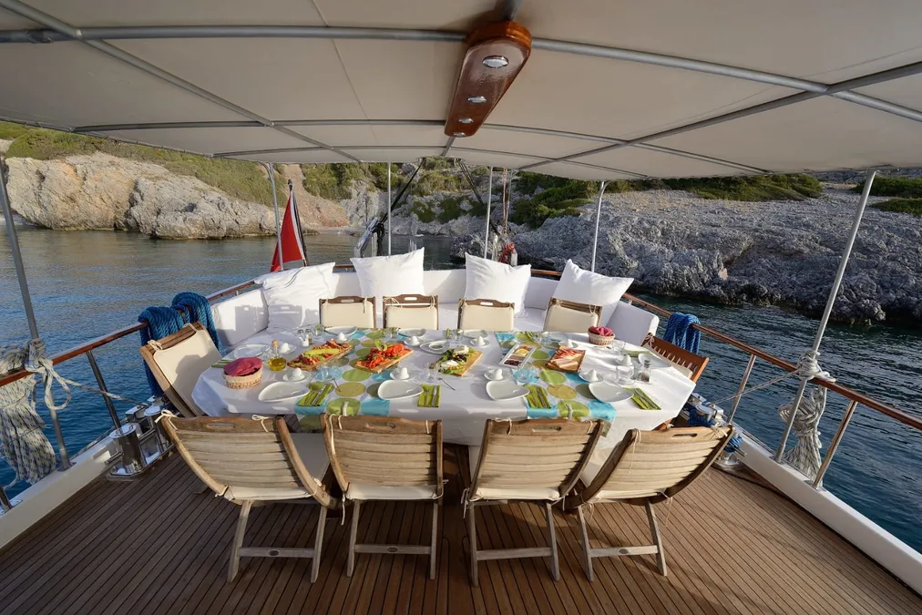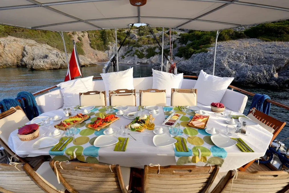 Yemek yapımından mürettebatımız sorumlu oluyor. Hazırlamak ve sunmak bizim işimiz. Kumanya ve yemek malzemeleri kiralama bedelinden hariç oluyor. Dilerseniz siz alışveriş yapıyorsunuz, dilerseniz sizin yerinize tekne mürettebatı market alışverişini yapıyor, siz ödemesini yapıyorsunuz.